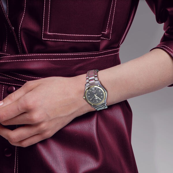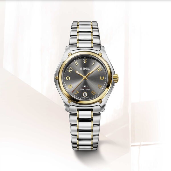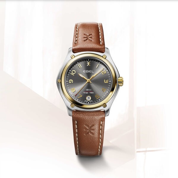 EBEL 1911 Damenuhr, Gehäuse aus Edelstahl und 18K Gelbgold, Ø 34 mm, anthrazit galvanisiertes Zifferblatt mit arabischen Ziffern, Datumsfenster auf 6:00 Uhr, innenseitig entspiegeltes Saphirglas, Gliederarmband aus Bicolor-Edelstahl, Faltschließe, zusätzliches braunes Kalbslederband, Schweizer Quarzwerk, wasserdicht bis 10 bar