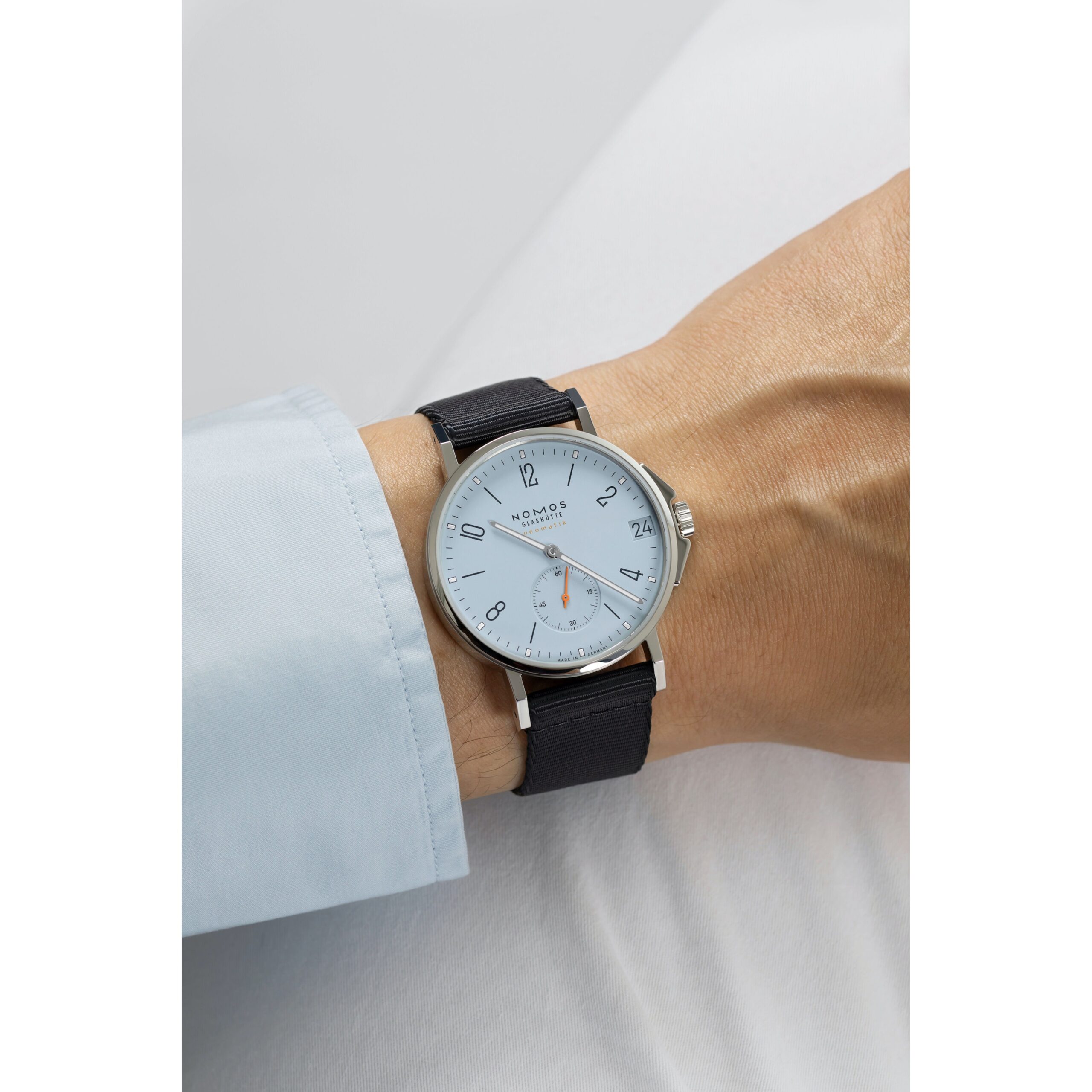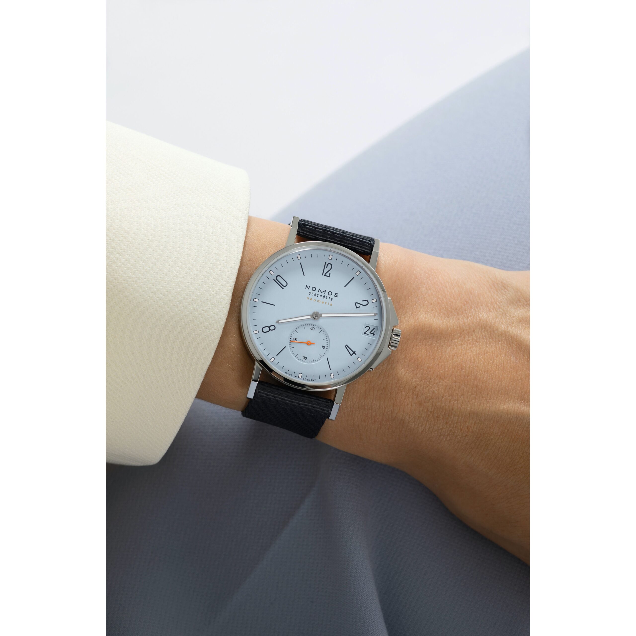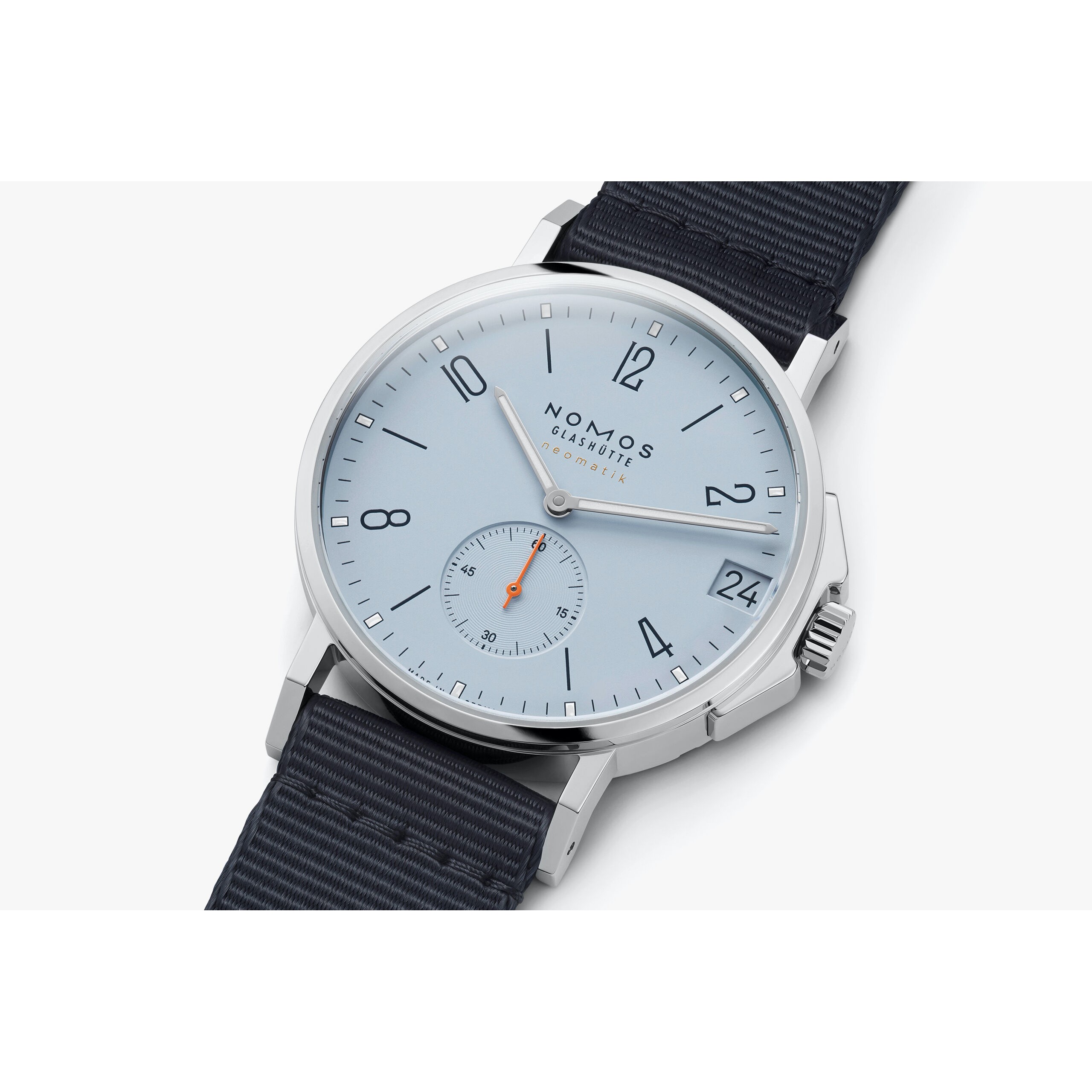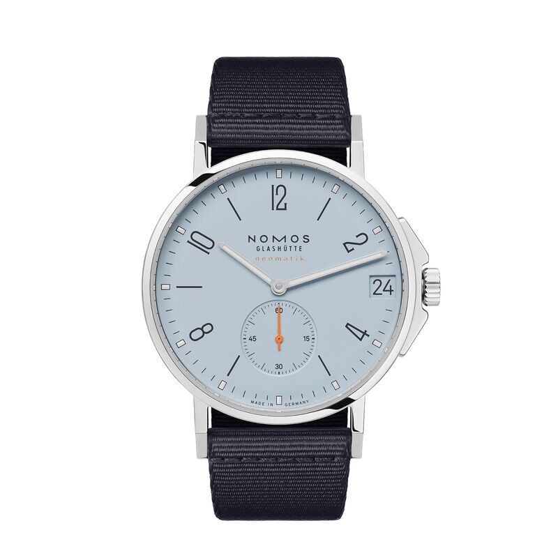 Sportlich und elegant zugleich: Eine Automatikuhr, mit der Sie abends auch in den Pool springen und die Sie unter Wasser ablesen können. Sie passt an jedes Handgelenk und verleiht immer Individualität. Ahoi neomatik 38 Datum steht für die ganze Freiheit rund um die Uhr. Automatisch und hochpräzise mit NOMOS-Swing-System und patentiertem NOMOS-Datumsmechanismus in erfrischendem Himmelblau. Eine mechanische Uhr für Kennerinnen und Genießer, für Freigeistige mit Anspruch und Abenteuerlustige mit Stil.