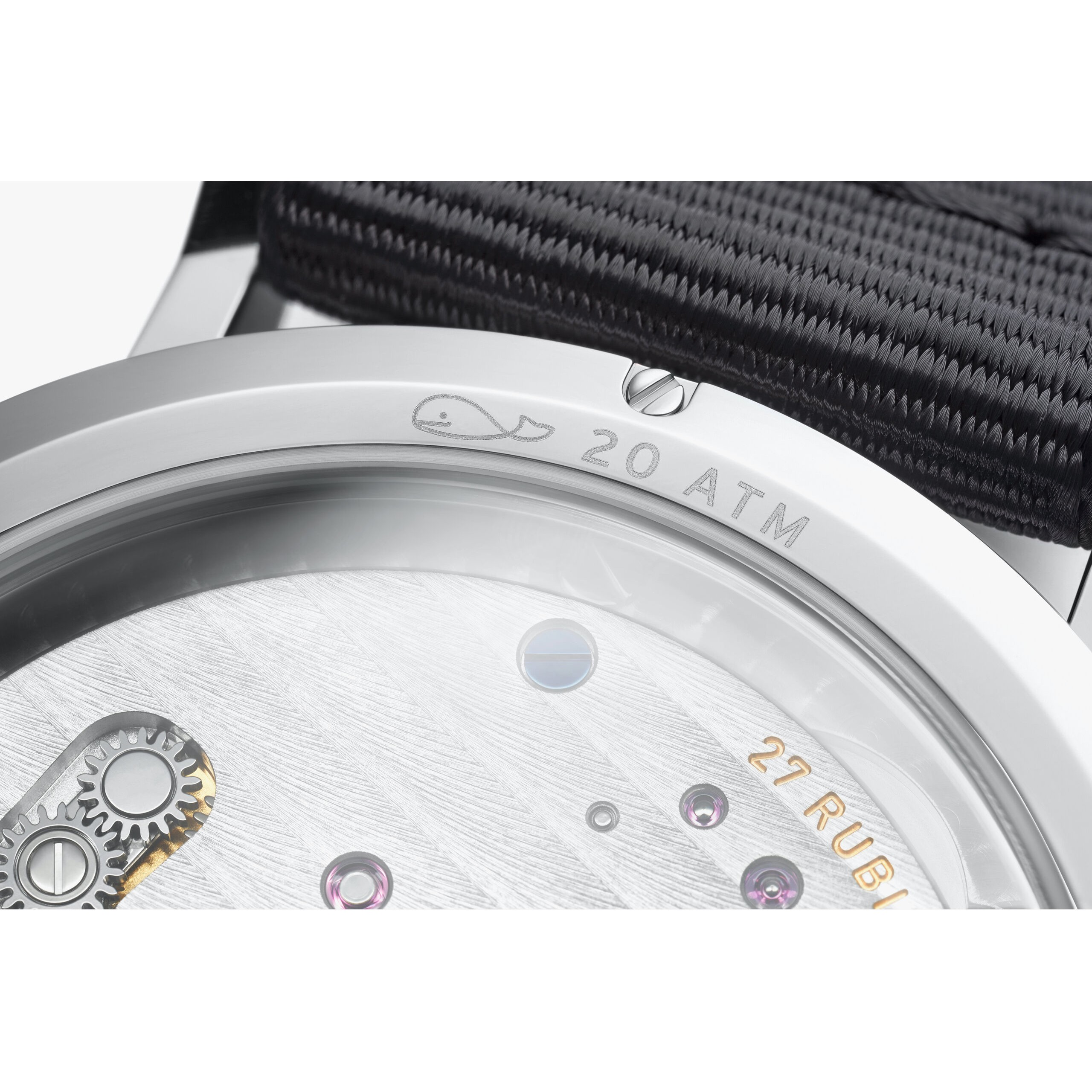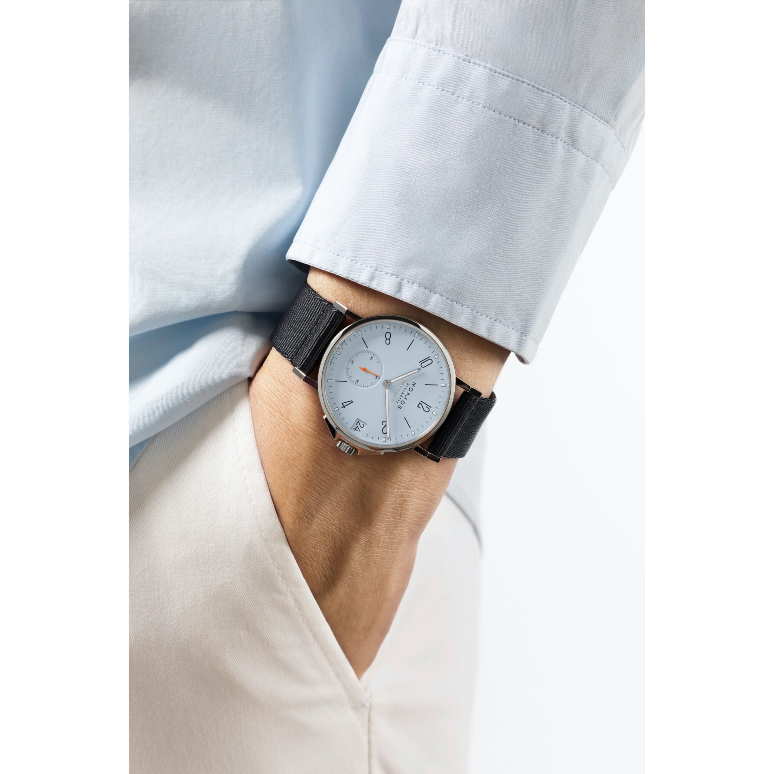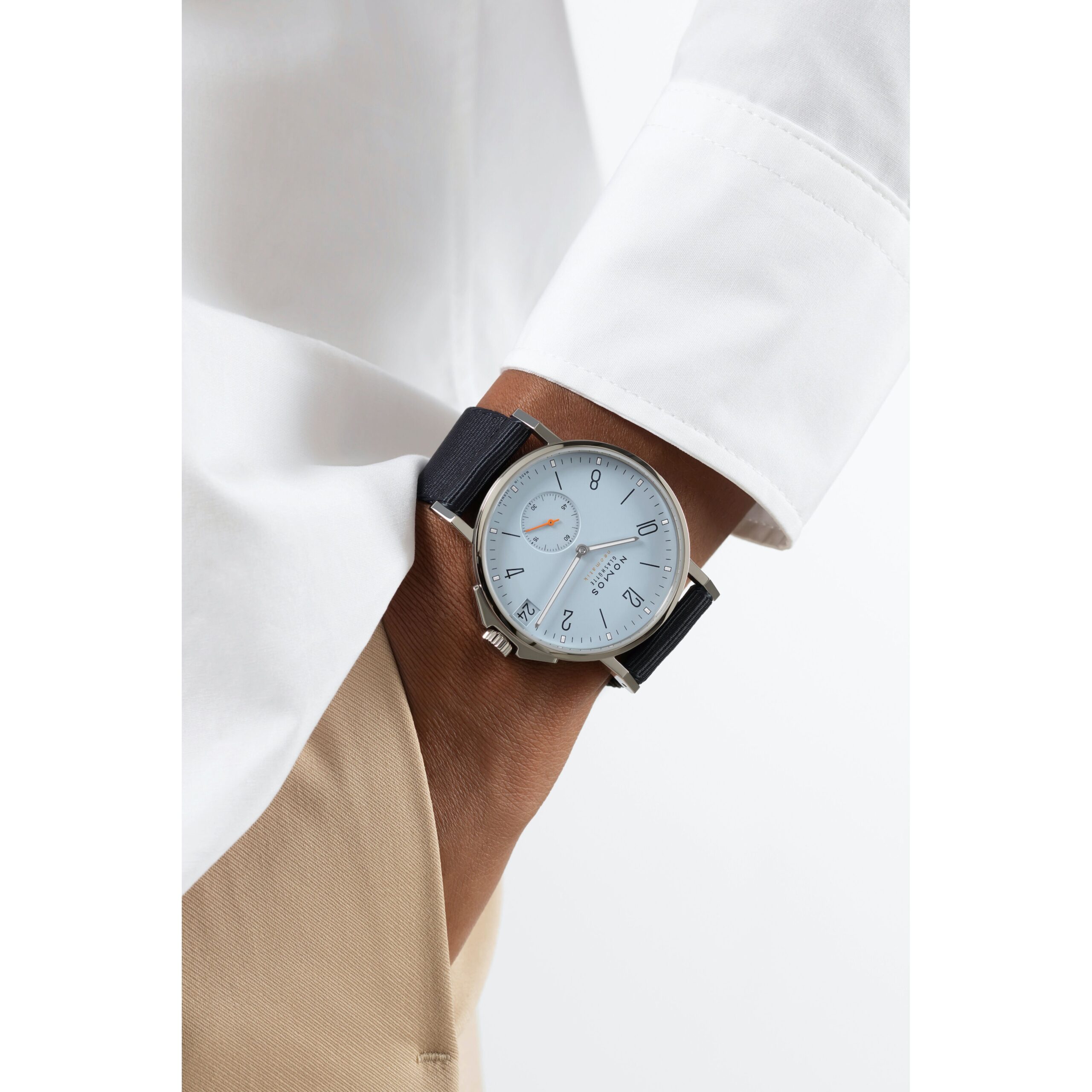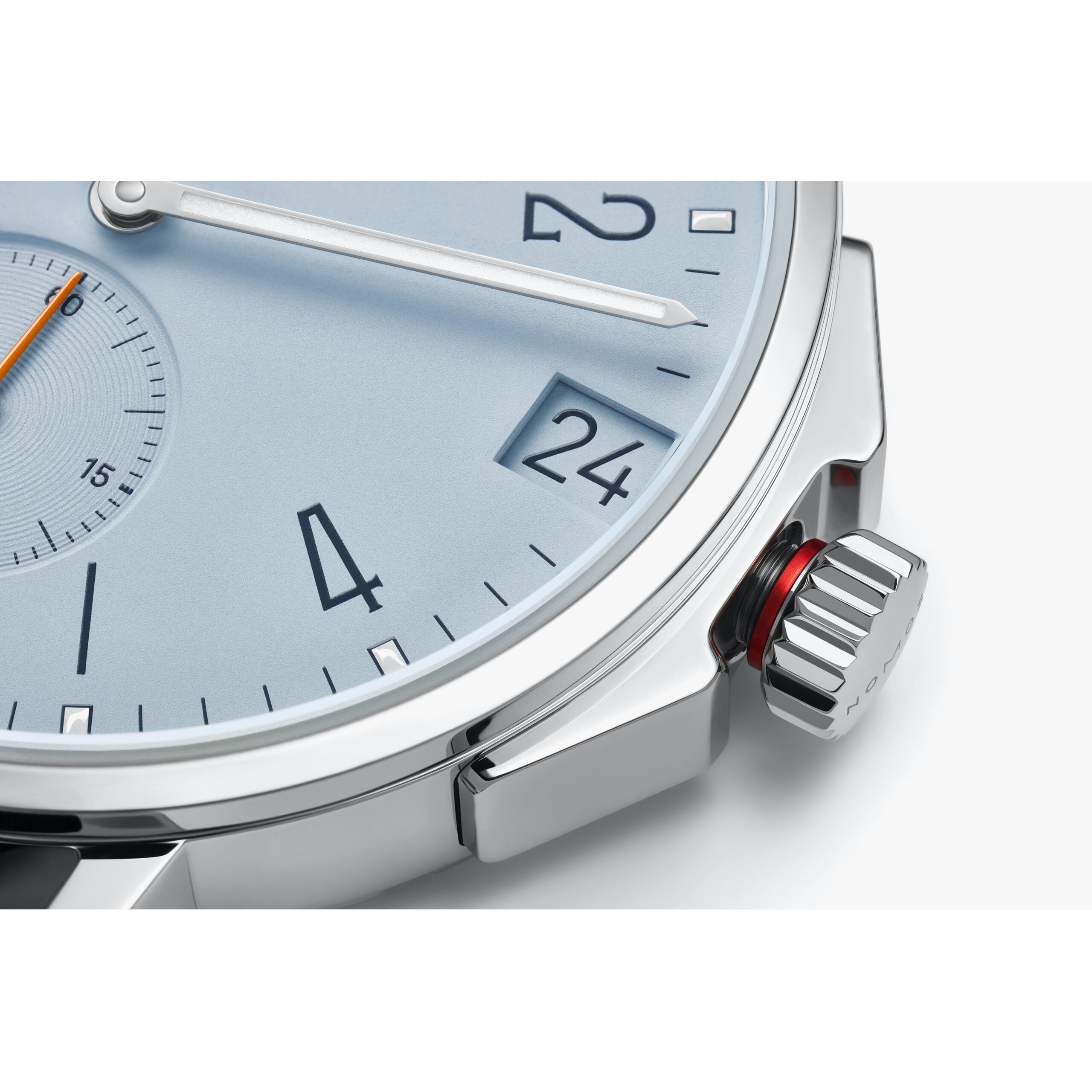 Sportlich und elegant zugleich: Eine Automatikuhr, mit der Sie abends auch in den Pool springen und die Sie unter Wasser ablesen können. Sie passt an jedes Handgelenk und verleiht immer Individualität. Ahoi neomatik 38 Datum steht für die ganze Freiheit rund um die Uhr. Automatisch und hochpräzise mit NOMOS-Swing-System und patentiertem NOMOS-Datumsmechanismus in erfrischendem Himmelblau. Eine mechanische Uhr für Kennerinnen und Genießer, für Freigeistige mit Anspruch und Abenteuerlustige mit Stil.