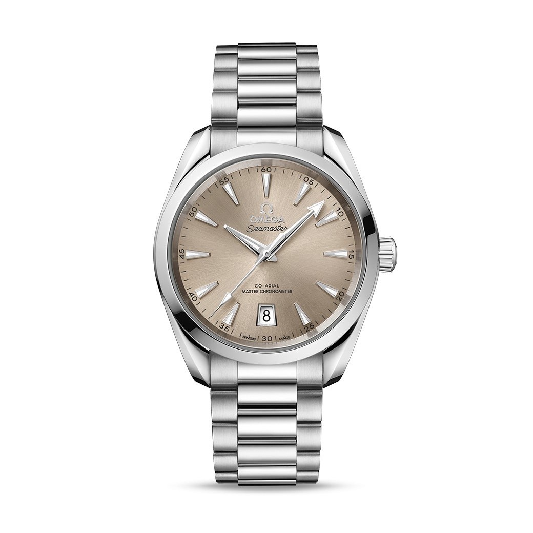 Die Seamaster Aqua Terra ist eine Hommage an OMEGAs großes maritimes Erbe. Dieses 38-mm-Modell verfügt über ein symmetrisches Gehäuse und eine Krone aus vollständig poliertem Edelstahl und ein Wellendekor auf dem Gehäuseboden.