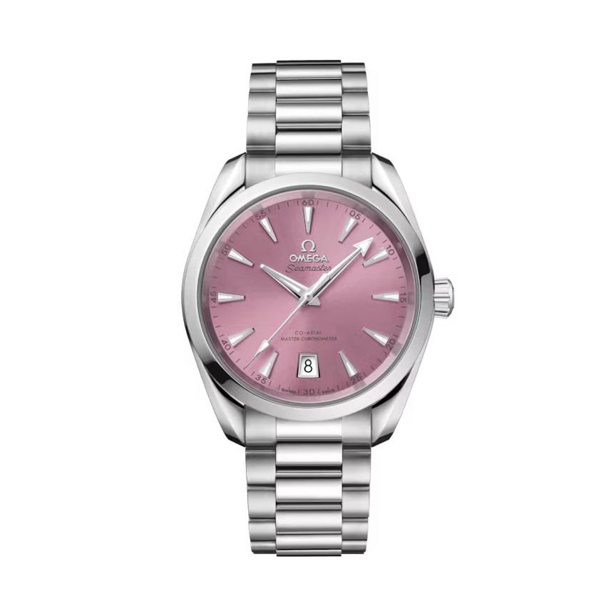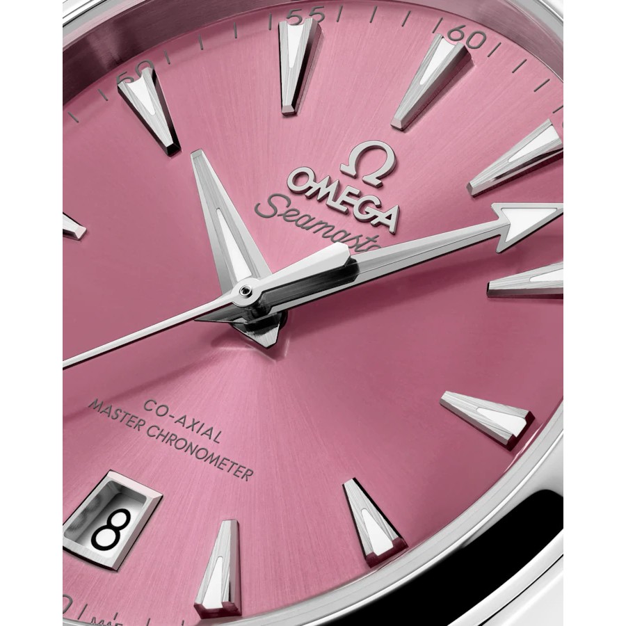 Die Seamaster Aqua Terra ist eine Hommage an OMEGAs großes maritimes Erbe. Dieses 38-mm-Modell verfügt über ein symmetrisches Gehäuse und eine Krone aus vollständig poliertem Edelstahl und ein Wellendekor auf dem Gehäuseboden.