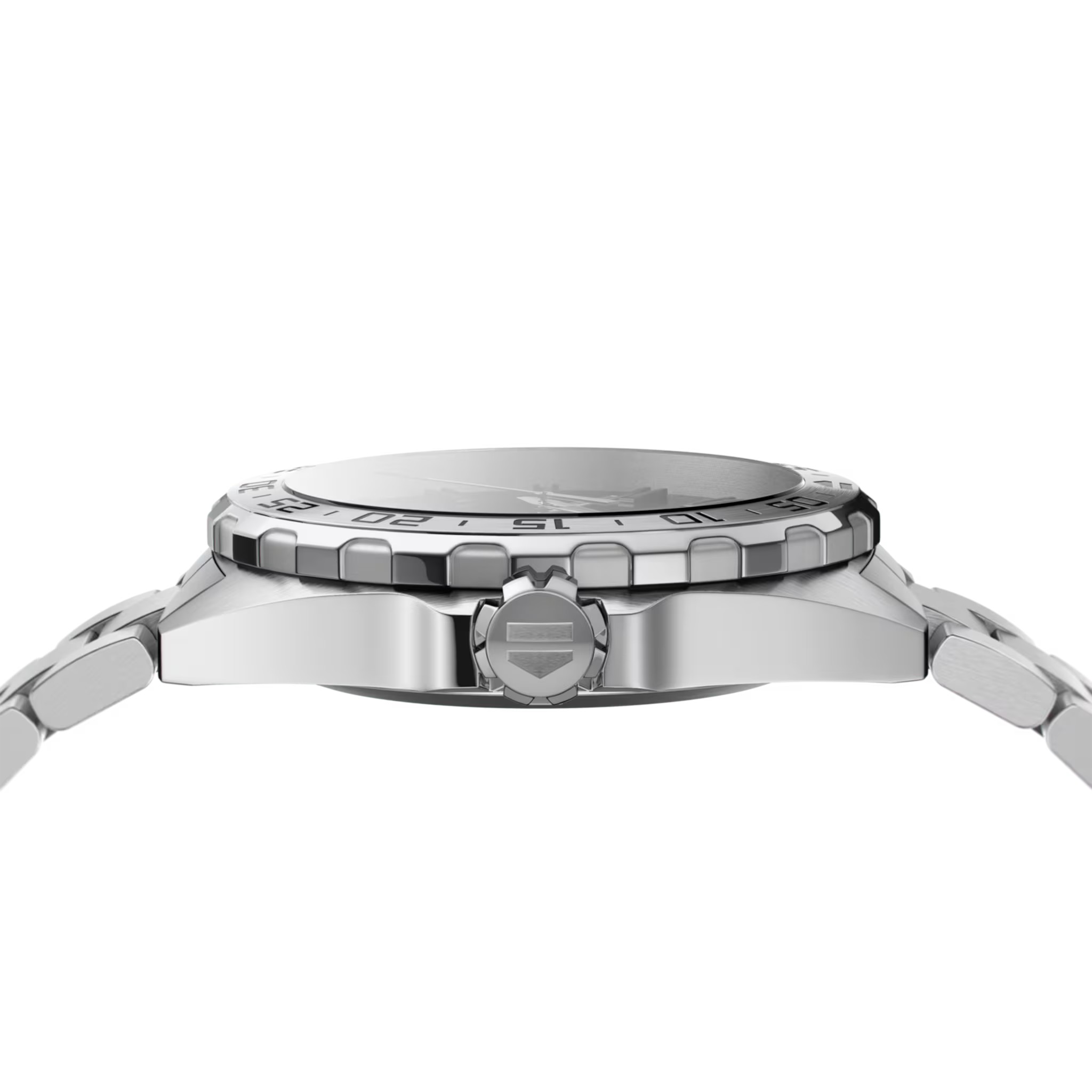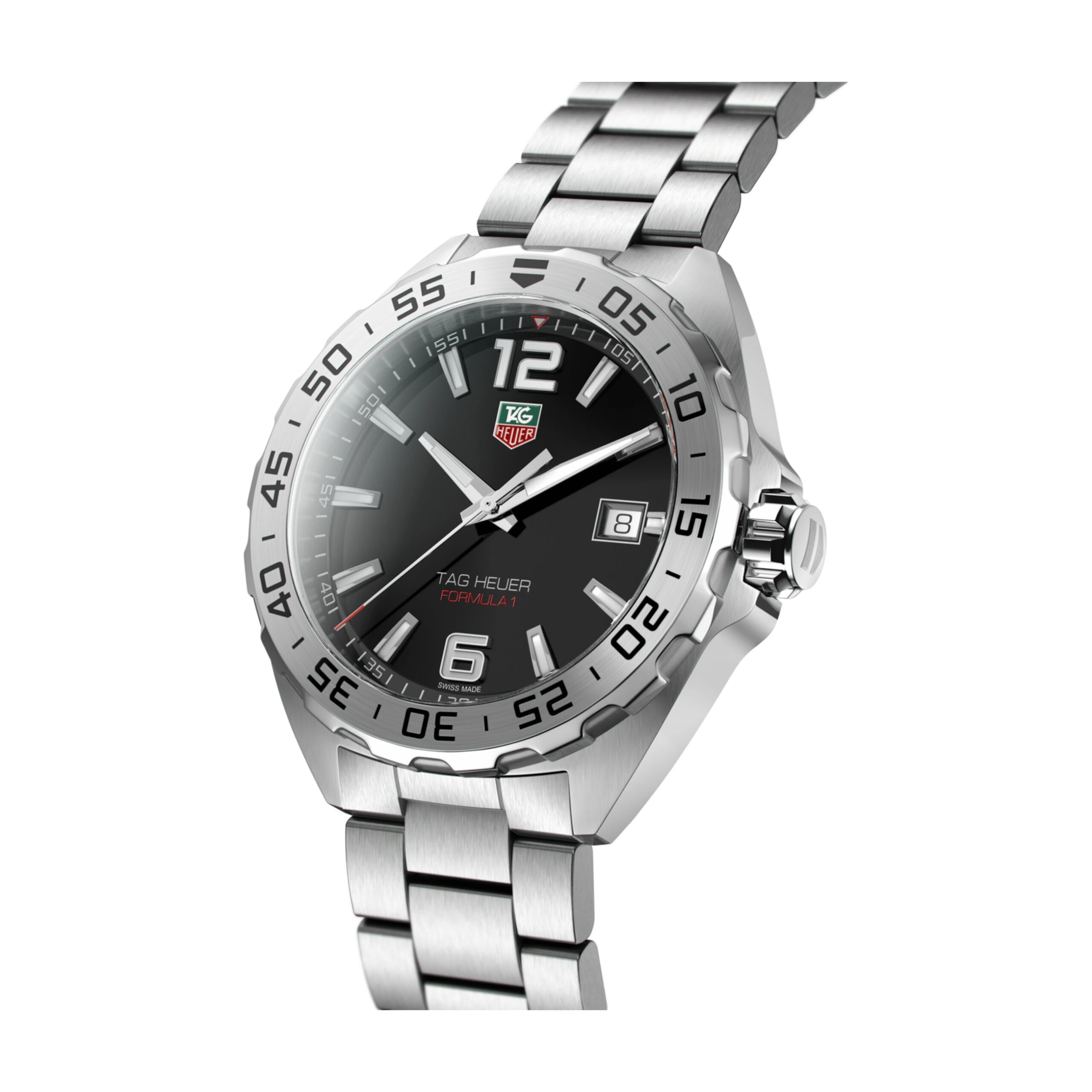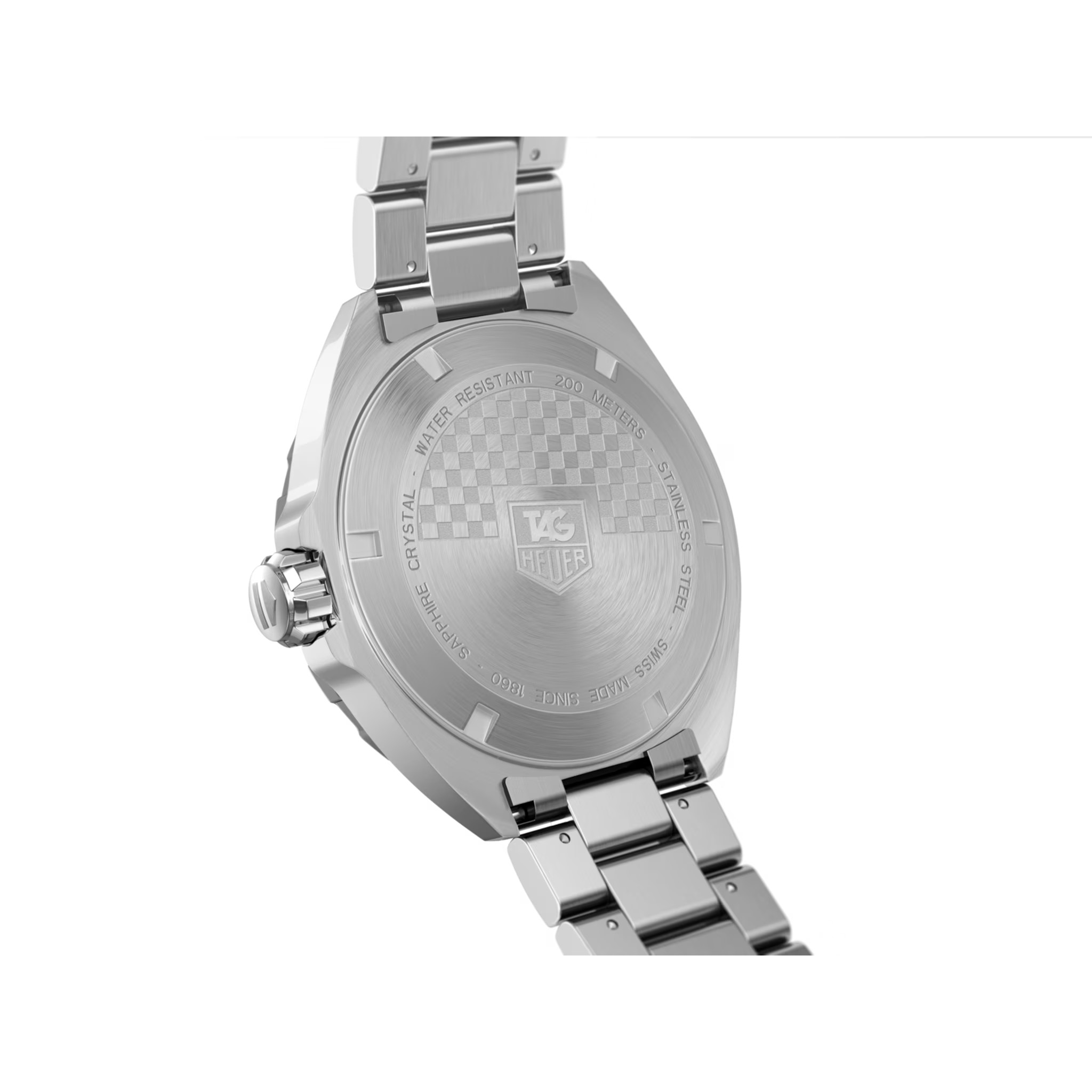 Eine schwarze Sportuhr mit 41-mm-Gehäuse aus Edelstahl, dreireihigem Armband aus Edelstahl und einseitig drehbarer Lünette mit 60-Minuten-Skala. Ein Sekundenzeiger mit roter Spitze und dem legendären weiß-rot-grünen TAG Heuer Logo verleihen dem sehr gut ablesbaren Zifferblatt ein markantes Design.
