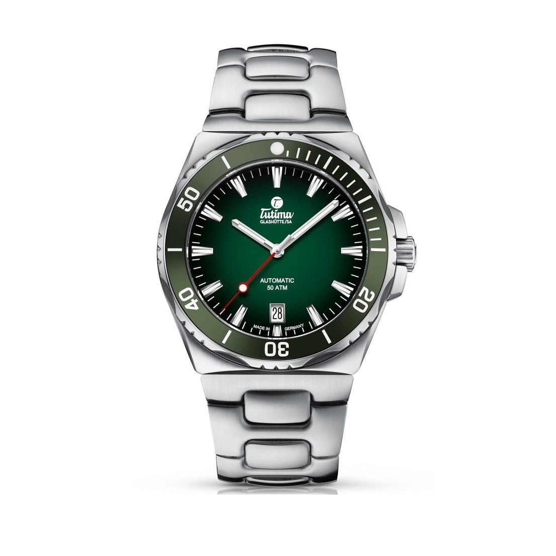 Erstmalig kommt bei der M2 Seven Seas gebürsteter und partiell polierter Edelstahl zum Einsatz und prägt die „S“-Linie mit seinen einzigartigen optischen und haptischen Eigenschaften. Das 44 mm-Gehäuse hält einem enormen Druck von 50 atm (entspricht 500 Meter Wassertiefe) problemlos stand. Boden und Krone sind verschraubt, letztere wurde zusätzlich durch seitliche Flanken vor Stößen gesichert. Das entspiegelte Saphirglas ist mit 3 mm extra stark und weist eine Härte von 9 Mohs auf – nur ein Diamant ist härter! Derart geschützt misst das Automatikwerk Kal. Tutima 330 stets zuverlässig die Zeit – perfekt ablesbar auch in der Dunkelheit durch Super-LumiNova beschichtete Indexe und Zeiger.