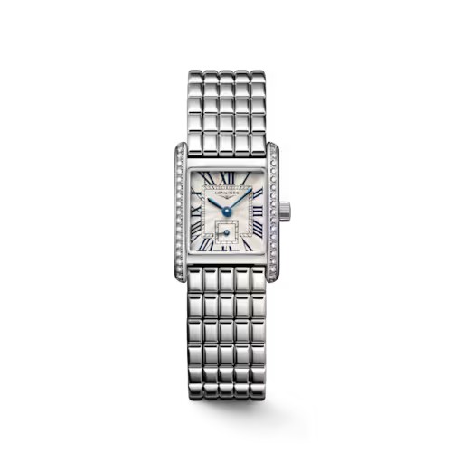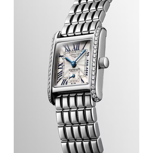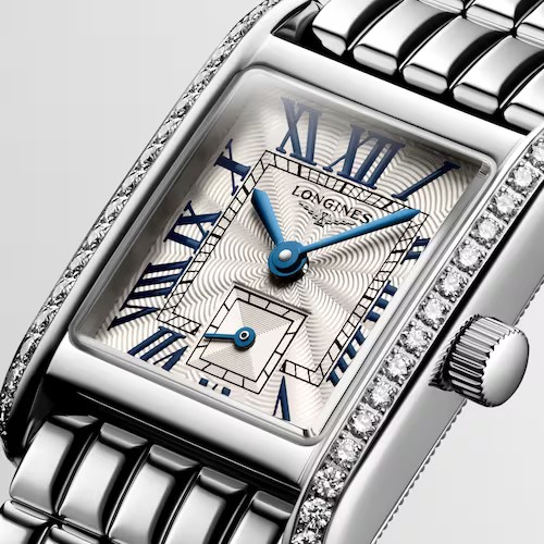 Die Mini DolceVita mag zwar klein sein, aber dafür kündigt sie ihre Ankunft umso größer an. Mit ihrem dezenten Profil, dem klassischen Design und den ästhetischen Variationen, die zugleich modern und zeitlos sind, ist sie ein kleines, aber mächtiges Meisterstück, das den unaufdringlichen Luxus und die zeitgenössische Eleganz von Longines gleichermaßen hervorragend zum Ausdruck bringt. Jede Referenz der Mini DolceVita Kollektion besitzt ein rechteckiges 21,50 mm x 29,00 mm großes Edelstahlgehäuse und wird von einem höchst präzisen L178 Quarz-Uhrwerk angetrieben. Dieses Modell besticht durch ein Gehäuse, das von 38 IF-VVS Top Wesselton Diamanten umrahmt ist. Und ein römisches rechteckiges silberfarbenes Zifferblatt im Inneren des Gehäuses unterstreicht die unnachahmliche Eleganz der Uhr. Die Uhr ist an einem neu kreierten Edelstahlarmband befestigt, das mit seinen 198 Gliedern den edlen Charakter der Uhr hervorhebt und einen hervorragenden Tragekomfort bietet.