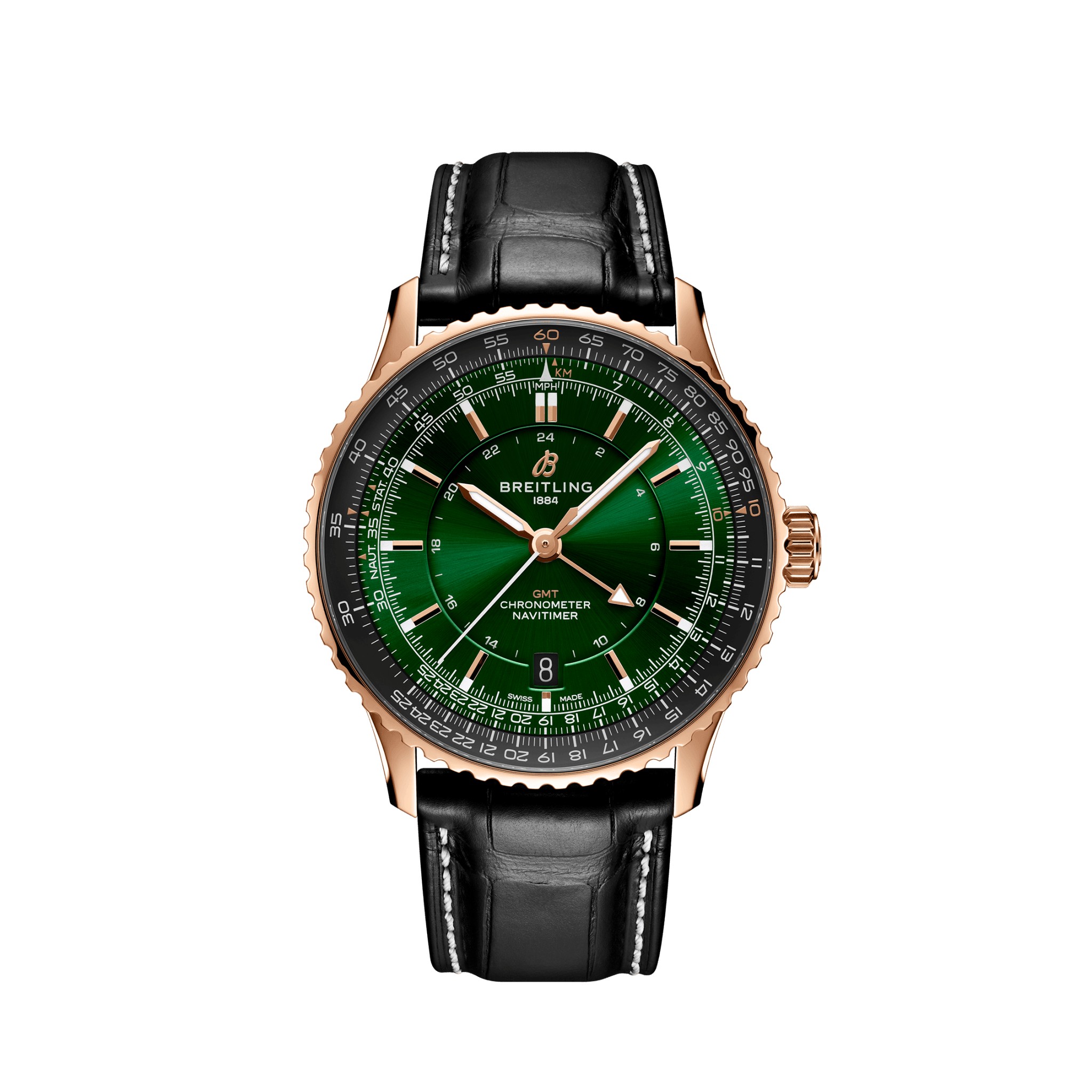 Breitlings vielseitigste Navitimer – For the Journey. Die Navitimer ist eine der bekanntesten Uhren, die je hergestellt wurden. Sie steht als eine der grossartigsten Uhren aller Zeiten auf den Sammlerlisten. Was 1952 als Instrument für Piloten begann, hat inzwischen eine tiefe Bedeutung für alle, die dieser Zeitmesser auf ihrer persönlichen Reise begleitet. Die Navitimer Automatic und Automatic GMT 41 präsentieren die Essenz des ikonischen Looks, verzichten auf den Chronographen und bewahren dabei ein ausgewogenes Zifferblatt. Die mittige Platzierung der 24-Stunden-Skala auf dem klaren Gesicht der GMT und der Automatic hebt den komplexen Rechenschieber hervor und veredelt die gesamte Ästhetik. Als weitere Verfeinerung der Kollektion wurde eine Lünette mit Griffmulde für einen zeitgenössischen Touch integriert, während abwechselnd polierte und gebürstete Finishes ein dynamisches Lichtspiel erzeugen. Armbänder aus Alligatorleder und mit nahtloser Doppelfaltschliesse garantieren höchsten Komfort. Das Angebot umfasst farbenfrohe Zifferblätter, die wahlweise in Edelstahl oder 18-karätiges Rotgold gefasst sind. Diese Neuerfindung der Navitimer, in der Klassik und Modernität zusammenfinden, ist für Uhrenbegeisterte und Stilbewusste gleichermassen geschaffen und spiegelt Breitlings Verpflichtung zu Tradition und Innovation in jedem Zeitmesser wider.