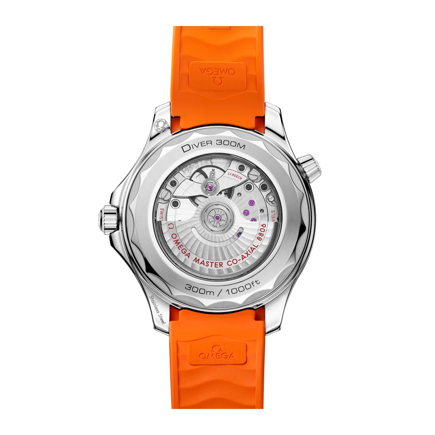 Am Handgelenk gehalten wird die Uhr von einem integrierten orangefarbenen Kautschukarmband mit Faltschließe, für den Antrieb sorgt das OMEGA Co-Axial Master Chronometer Kaliber 8806, das durch den Saphirglasboden bewundert werden kann.