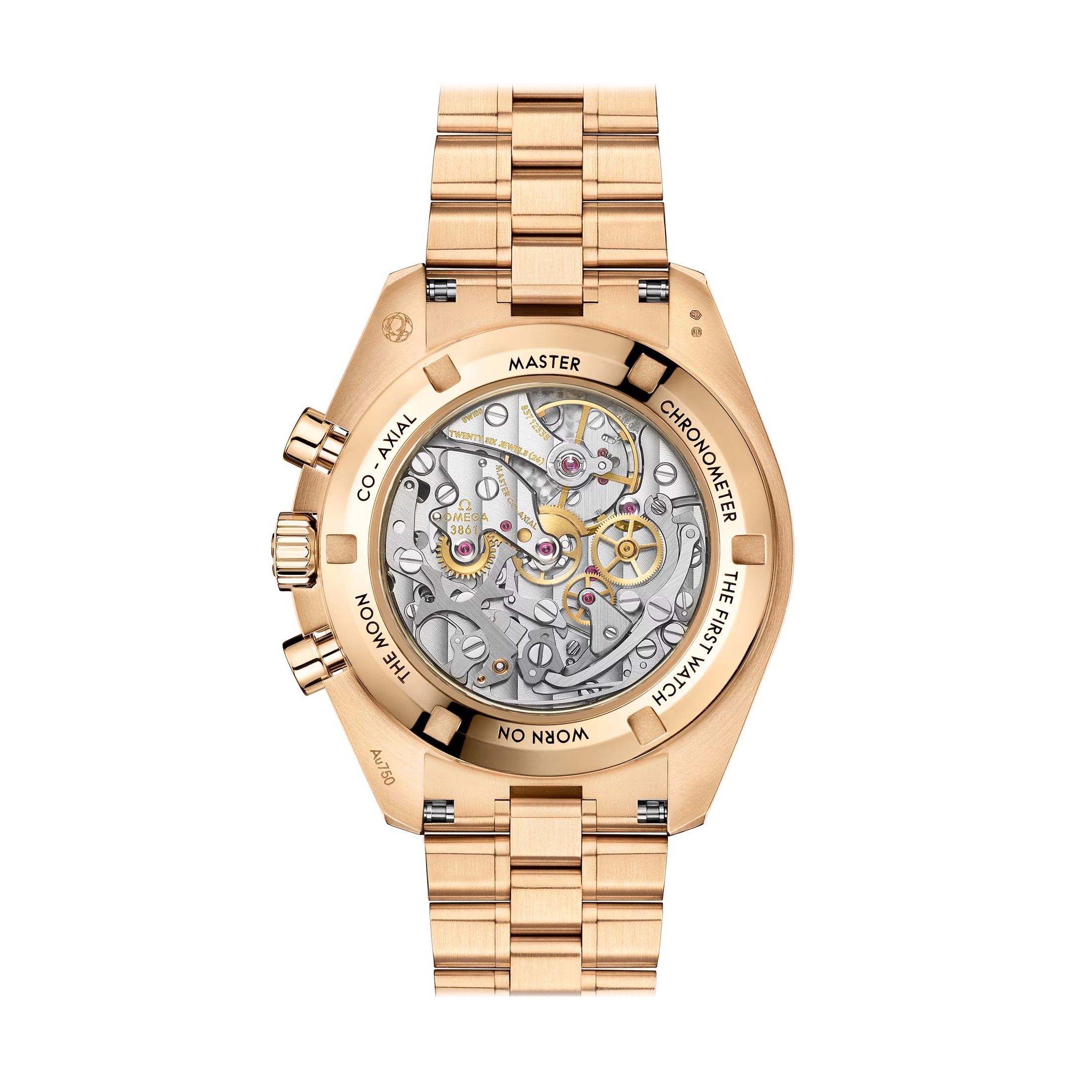 Der doppelt abgeschrägte Gehäuseboden aus poliertem 18 K MoonshineT-Gold ist mit den Worten FIRST WATCH WORN ON THE MOON in Schwarz graviert. Die Moonwatch wird von OMEGAs Co-Axial Master Chronometer Kaliber 3861 mit einem besonderen, luxuriösen Finish angetrieben.