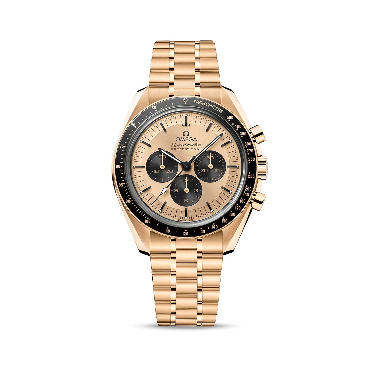 Die von der 4. Speedmaster Generation inspirierte 42-mm-Moonwatch mit Gehäuse und Armband aus 18 K MoonshineT-Gold hat ein „abgestuftes“ Zifferblatt aus 18 K MoonshineT-Gold mit Sonnenschliff und schwarzen Hilfszifferblättern und Indizes. Der schwarze Keramik-Lünettenring mit OMEGA CeragoldT-Tachymeterskala ist mit dem berühmten „Punkt über der 90“ versehen.