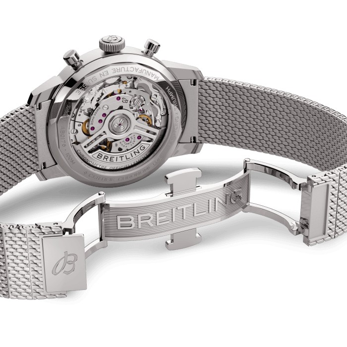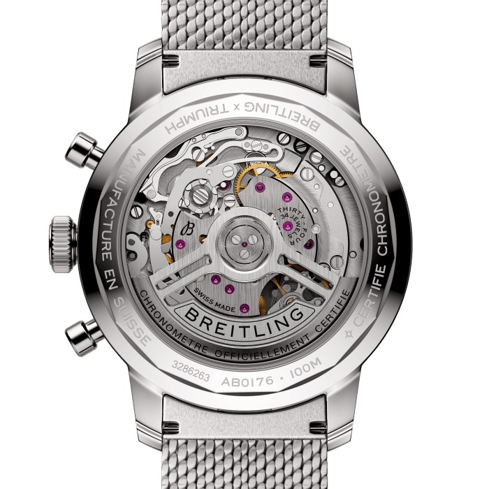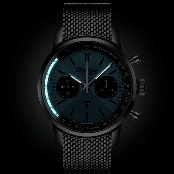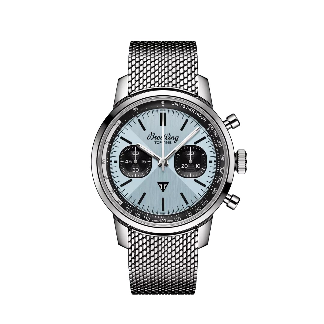 Die 1960er Jahre waren ein Jahrzehnt, das von Experimentierfreude, Spass, Freiheit und Energie geprägt war. Ob man mit einem Motorrad eine Spritztour machte oder in einem Sportwagen Gas gab, das Leben lief auf Hochtouren. Willy Breitling spürte diesen Tempowechsel und nahm sich vor, einen unkonventionellen Chronographen zu entwickeln, der den Schwung der Epoche einfing. Er nannte ihn die Top Time. Diese lebendige Tradition wird auch heute noch fortgesetzt, denn Breitling arbeitet bei der Entwicklung der Top Time mit einigen der angesagtesten Namen der Auto- und Motorradindustrie zusammen. Das Highlight dieser in Zusammenarbeit mit der britischen Motorradmarke Triumph entstandenen Uhr ist ihr eisblaues Zifferblatt. Dieser einzigartige Farbton hat zwei grosse Vorgänger zum Vorbild: eine blaue Triumph Thunderbird 6T von 1951 und eine seltene eisblaue Breitling Top Time Ref. 815 aus den 1970er-Jahren. Sammler werden sicher noch einige andere Anspielungen auf die alte Breitling entdecken, darunter ein Retro-Logo, pilzförmige Chronographendrücker und ein Zifferblatt im «Zorro»-Design. Das Schleifenmotiv, das in den 1960er-Jahren auf der Top Time eingeführt wurde (und den Spitznamen für die Maske des verschlagenen Haudegens trägt), wurde auf subtile Weise durch eine Metallbürsttechnik integriert, die ein leuchtendes Spiel aus Licht und Textur erzeugt. Zu den Designelementen gehören ein Triumph-Emblem bei 6 Uhr, die Tachymeterskala für die Geschwindigkeitsmessung sowie die kontrastierenden eckig-abgerundeten Hilfszifferblätter, die den Anzeigen auf den Instrumententafeln klassischer Fahrzeuge nachempfunden sind. Zudem hat sie einen Motor unter der Haube, mit dem man sich sehen lassen kann: das aussergewöhnliche Breitling-Manufakturkaliber 01.