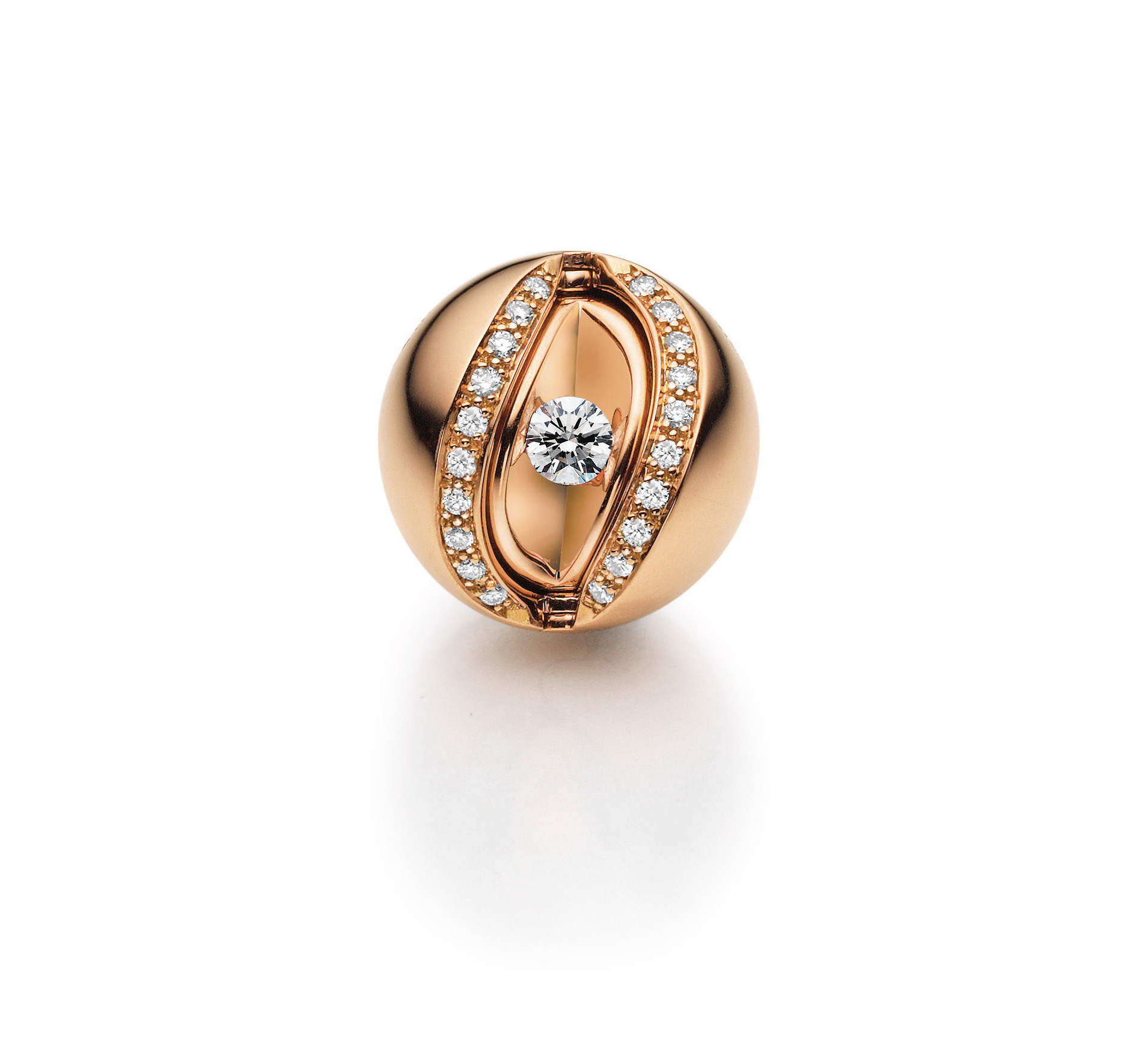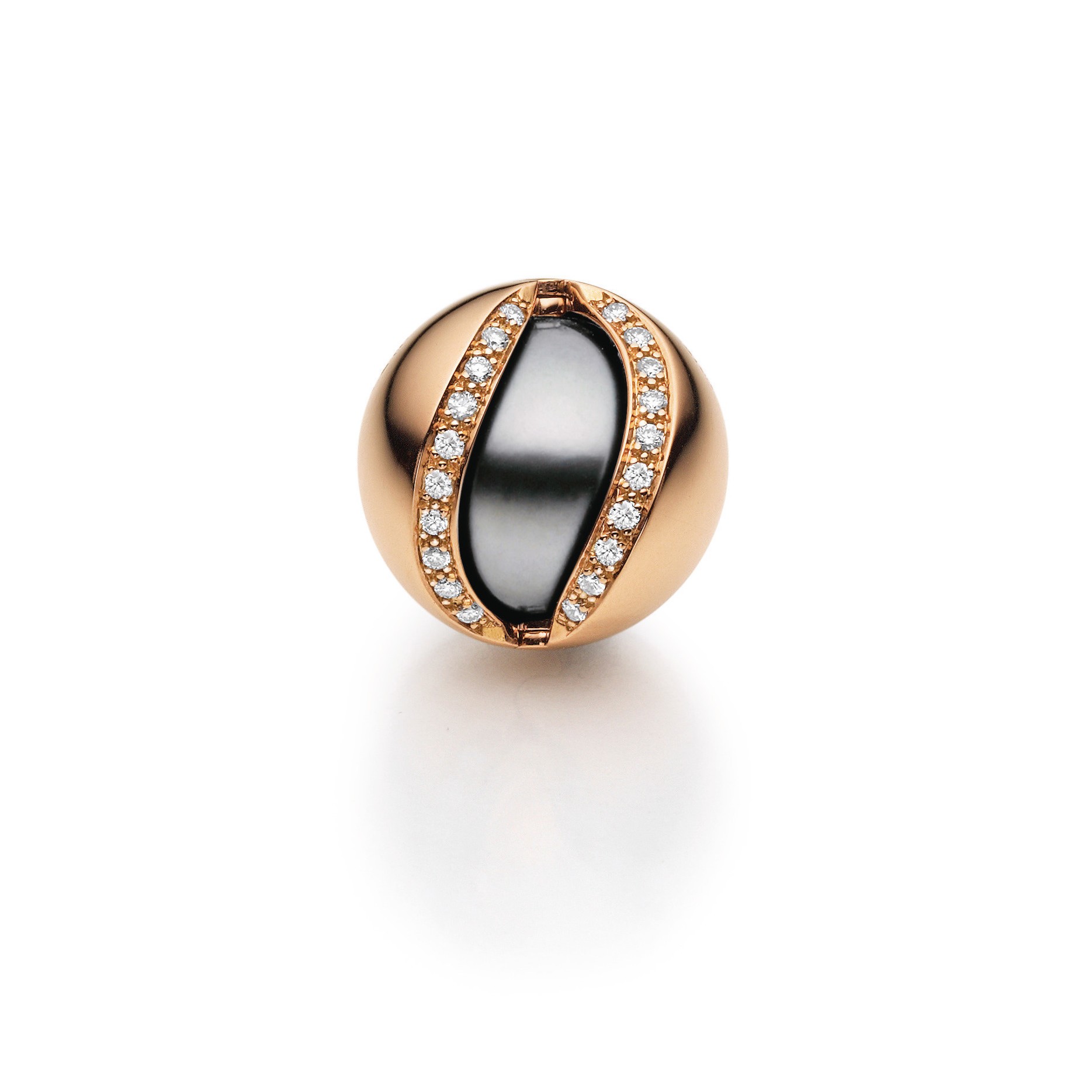 Der Klassiker unter den Mystery Sphere Designs: Ein funkelnder, im Spalt gefasster Brillant in Liaison mit einer zart schimmernden Tahiti- oder Südsee-Zuchtperle, teils beidseitig eingerahmt von feinen Brillantlinien. Der facettenreiche Hingucker schlechthin. Die Kombination von organischer Zuchtperle und edlem Brillantpavé ist klassisch und harmonisch im Look. Ob an einer Lederschnur, einer Strickkette, einem Seil-Collier oder an einer Perlenkette – mit allen läßt sich dieses Design gekonnt kombinieren.