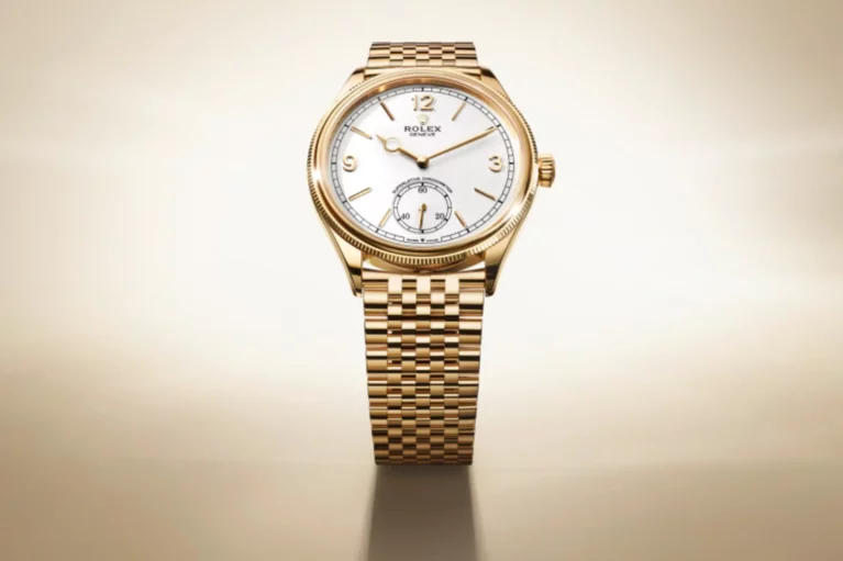 Zwar betrafen die revolutionären Innovationen von Hans Wilsdorf die technischen Merkmale der Armbanduhr, doch waren sie auch das Ergebnis einer überaus starken ästhetischen Vision. Die Silhouette des Gehäuses und das Design des Zifferblatts der 1908 interpretieren den klassischen und dennoch sehr modernen Geist der originalen Oyster Perpetual Armbanduhren neu. Die fein bombierte und geriffelte Lünette ist ein ästhetisches Markenzeichen und zeugt von einem Streben nach Zartheit in all ihren Formen.